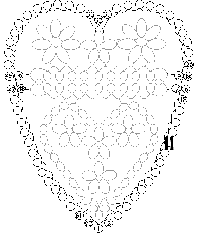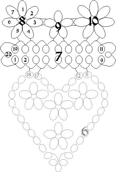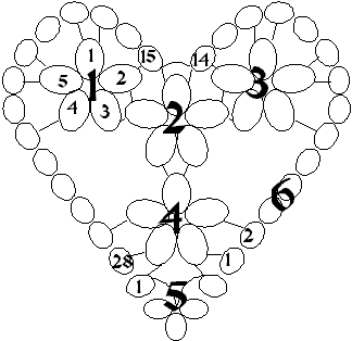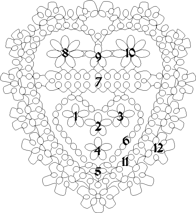 This pattern is made in 12 parts (I will refer to them as motifs) as numbered below. These motifs are built and assembled in three sections: the heart, the crown, and the outer heart. This pattern uses rings, chains, and split rings. You should review the following abbreviations.